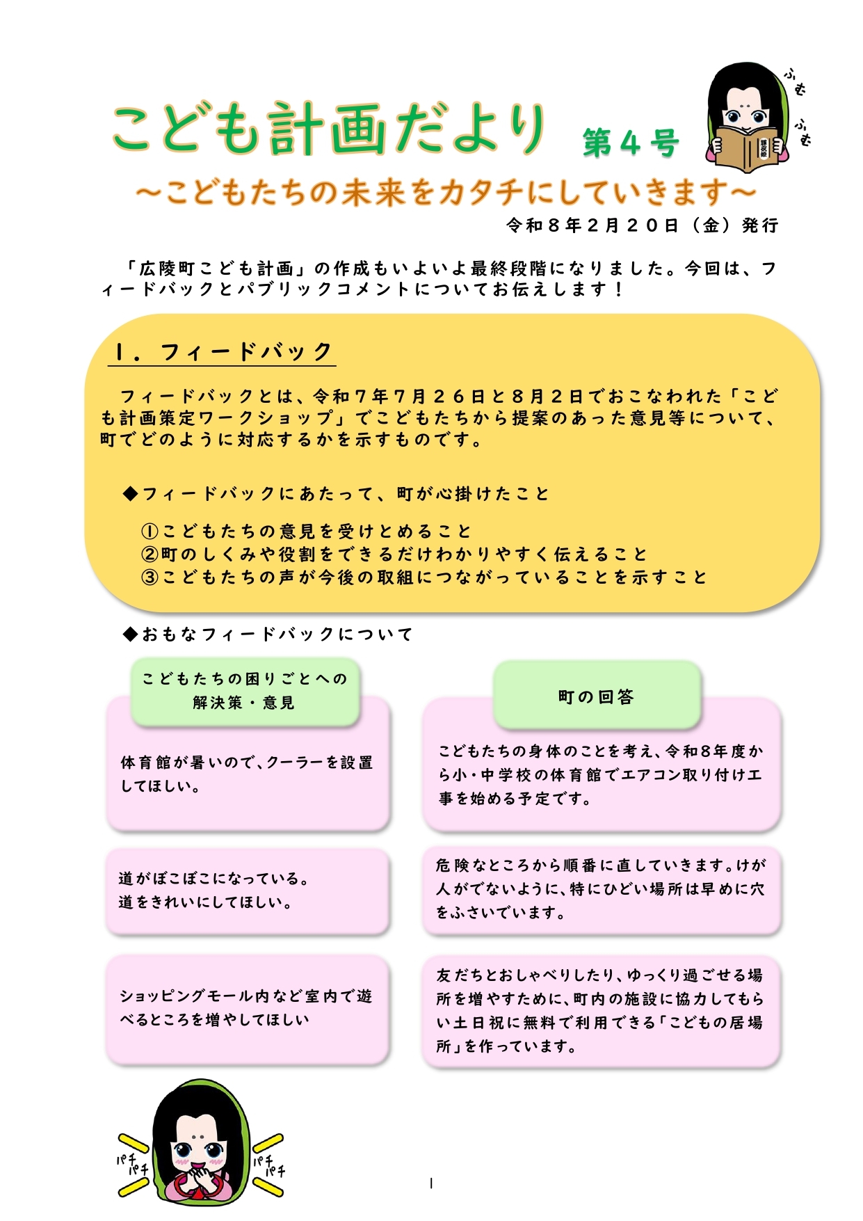 「広陵町こども計画」の作成もいよいよ最終段階となりました。今回は広陵町こども計画策定ワークショップでこどもたちからの意見等に対するフィードバックとパブリックコメントでいただいた意見についての回答を掲載しております。